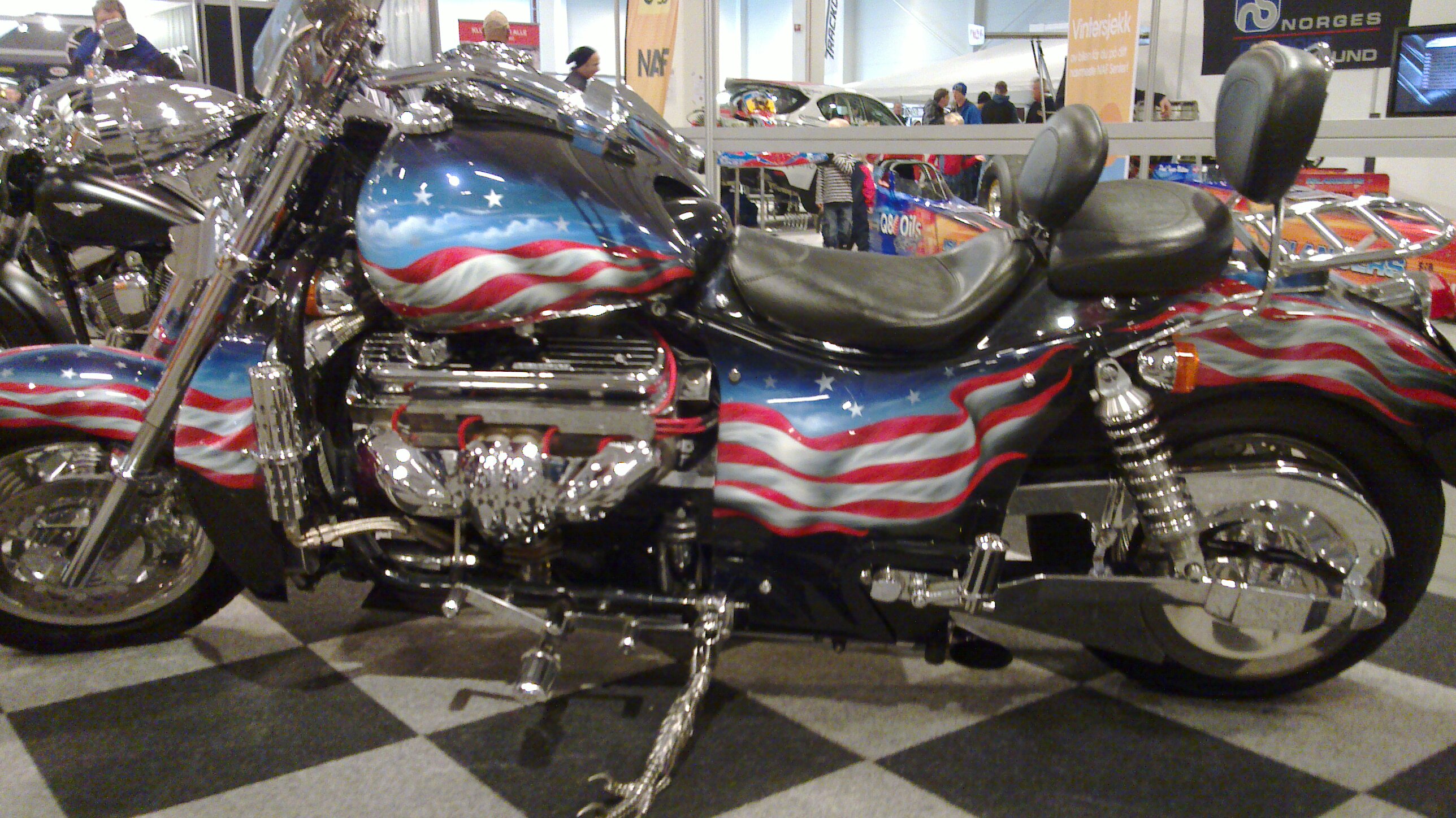Var på Brom på Hellerudsletta. Der hadde de bl.a. en Boss Hoss 🙂 Tror ikke jeg vil ha en V8’er mellom beina, men hvem vet. Kan hende det vibrerer deilig hehe 🙂 Møtte en Boss Hoss med 8,2L Big Block på sørlandet tidligere i år. 600kg på 2 hjul. Bør være asfalt under sidestøtten da 🙂