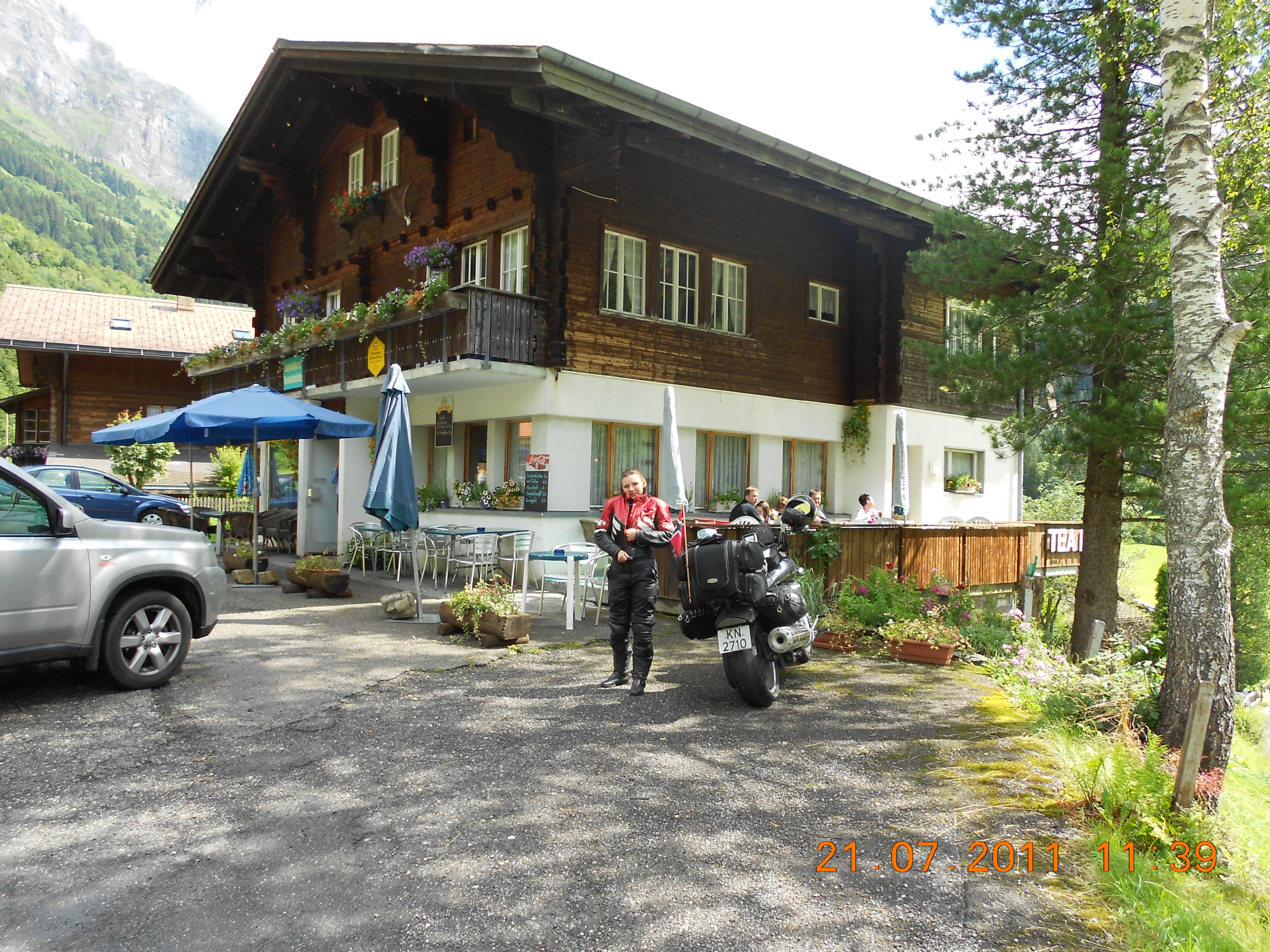 Etter passene gikk turen i rettning Sursee. Vi fikk regn igjen å vi stoppet å tok på regntøy. Innen vi var ferdig påkledd var regnværet gitt seg igjen. Vi var fremme hos Yamaha i Sursee klokken 1345. Her stilte Adreas som jeg hadde snakket med på telefonen opp i butikken å ytet max service. Han sørget også for at verkstedet fikk beskjed om å prioritere disse nordmennene som var på langtur. På vei inn i Alpene var bakdekket bare slitt på midten, men i dag hadde faktisk strien begynt å bli synelig på venstre side av dekket så det var på høy tid å skifte. En stor takk til Erik som hadde surfet på nettet kvelden før å skaffet oss telefon nummer og adressen. Du kan få fast jobb som backoffice når Natalie og jeg er på reiser 🙂