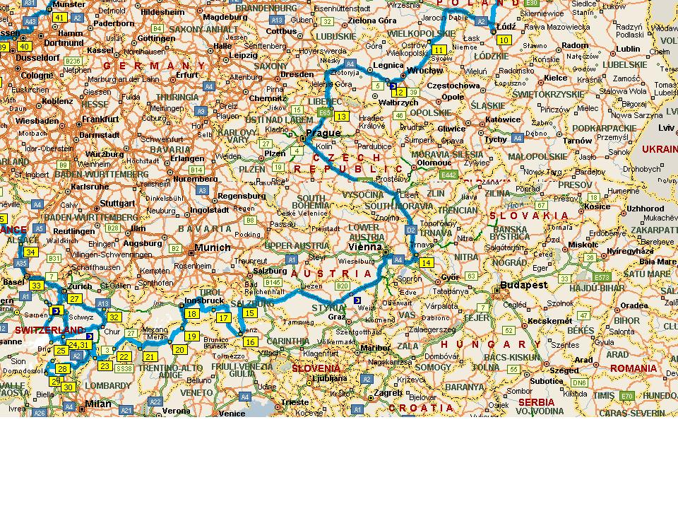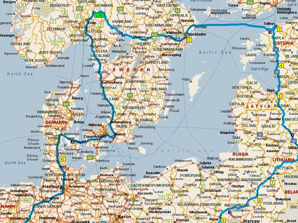 Totalt sett ble det 17 land på denne turen. Følgende land ble besøkt: Sverige, Estland, Latvia, Lithuania, Polen, Tsjekkia, Slovakia, Østerike, Sveits, Italia, Tyskland, Lichtenstein, Frankrike, Luxembourg, Belgia, Nederland og Danmark.