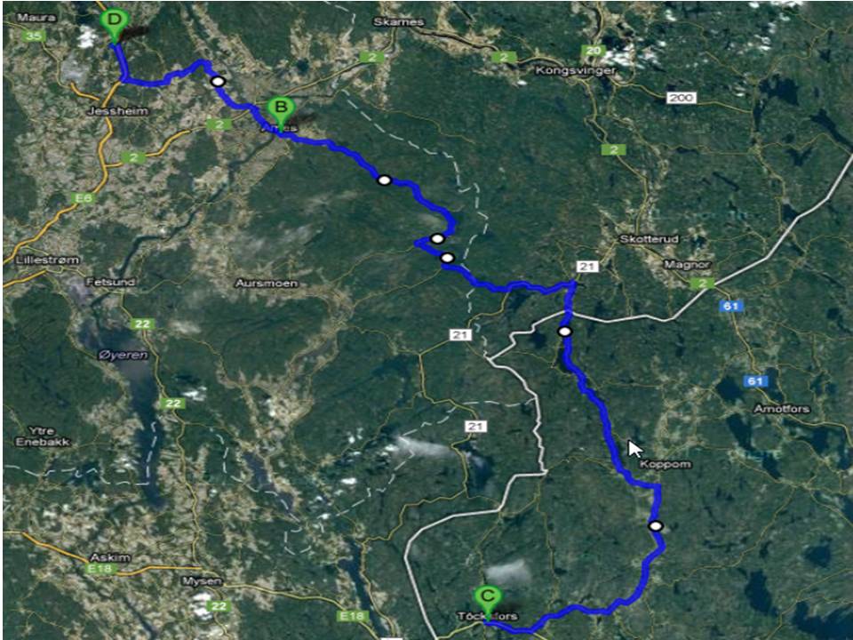 Har hatt en nydelig dag på flotte Norske og Svenske skogsveier. Ble med 4 andre fra Frogner området som skulle ut på grusveier denne litt kalde lørdagen. En av gutta snudde etter ca 15mil pga dagen også skulle brukes til andre ting. en tok asfalten hjem fra Töcksfors, men vi tre andre valgte samme rute tilbake. Jeg må innrømme at jeg ikke har helt kontroll på hvilke veier vi kjørte, men det burde ligne på det jeg har satt opp på kartet under.