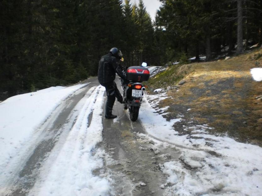 Så da var det bare å forsette. Man trodde jo ikke at det kunne bli værre men det kunne det altså. Dekkene på Suzukien fungerer greit på asfalt og grus, men på snø var de håpløse. Å manøvrere på snø med disse dekkene, bøyd styre, problemer med giringen å en clutch som gjorde at sykkelen gikk uansett om clutchen var inne eller ute måtte jo ende med en tur til i bakken 🙂