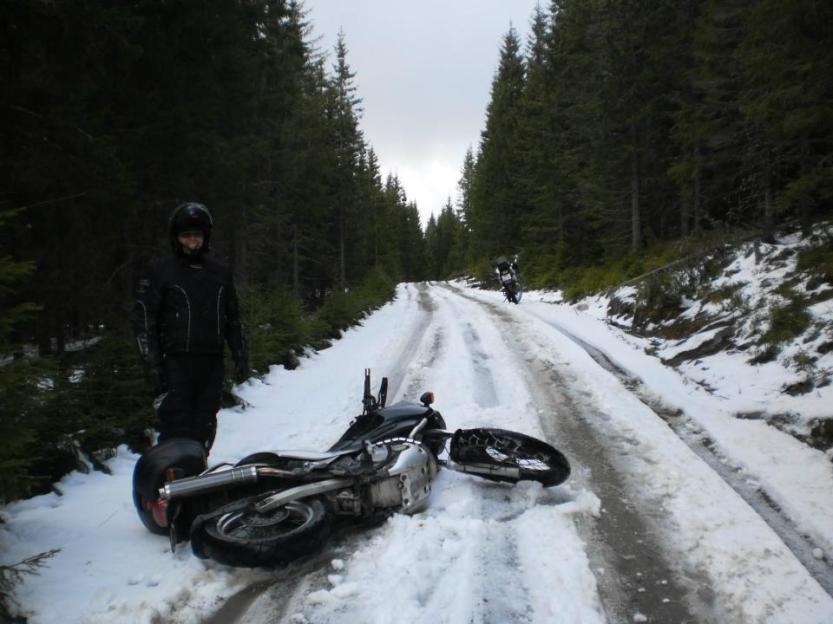Hva som skjedde fikk man ikke mulighet til å tenke over før man skled bortover snøen sammen med sykkelen å bare håpet på at Jonny som kom bak rakk å stoppe. Fordekken skled rett ut til høyre uten forvarsel å uten at jeg hadde vært borte i bremsen eller andre ting som skulle tilsi at noe skulle gå galt. Styret fikk seg en skikkelig smell, så det er det bare å få skiftet. Clutchen ble litt merkelig etterpå å det samme ble girhendelen, men disse to tingene kan man nok justere.