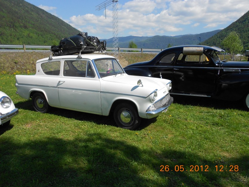 Noen som husker Ford Anglia 🙂 Pent parkert mellom en WV Boble og en Chrysler (tror jeg).