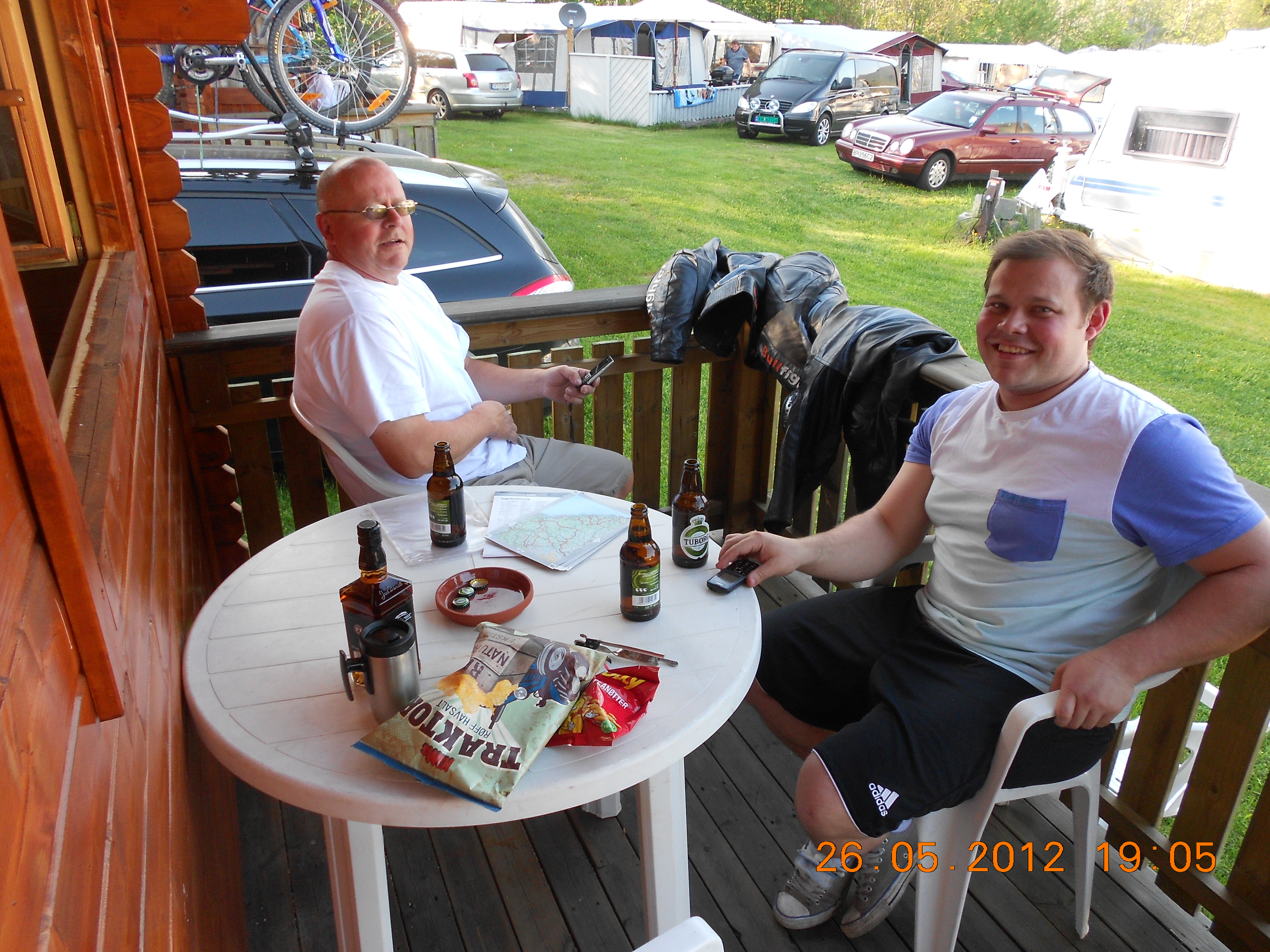 Siden jeg kom til å være fremme en god stund før Eldar og Ynvge ble vi enige om at jeg skulle ta meg av handlingen av mat. Så 15 minutter før det stengte kjørte jeg innom butikken på Seljord. Kjøpte en pose med øl og en pose med mat, men problemet var bare at jeg fortsatt ikke hadde vært på campingen å losset bagasjen så dermed hadde jeg ikke mulig het for å få varene med meg på sykkelen. Varene ble derfor gjømt i nærheten av butikken, kjørte til campingen å fikk nøkkelen til hytta, losset bagasjen å kjørte tilbake for å se om øl og matvarene fortsatt sto der jeg forlot det. Heldigvis gjorde det det. Tilbake til hytta med disse tingene, opp til Seljord igjen for å ta en middag sammen med de andre, så kunne vi endelig sette oss ned å nyte en kald øl i 28 varme grader på terrassen 🙂