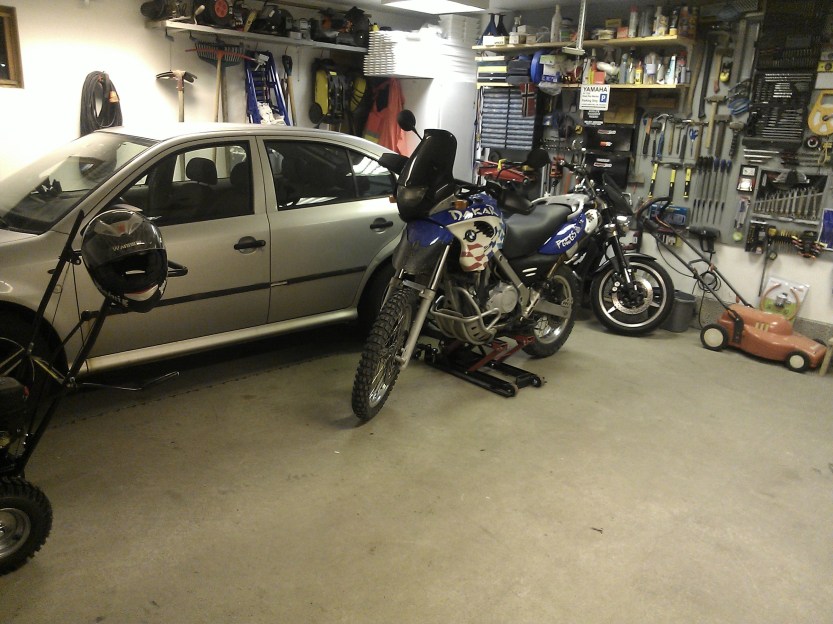 Selv om jeg håper at det er lenge til vinteren kommer er i alle fall garasjen ryddet og klar. Dvs at alt som ikke hører hjemme i garasjen er flyttet opp på garasjetaken, så dermed er det plass til 2 motorsykler, 2 biler og 1 snøfreser.