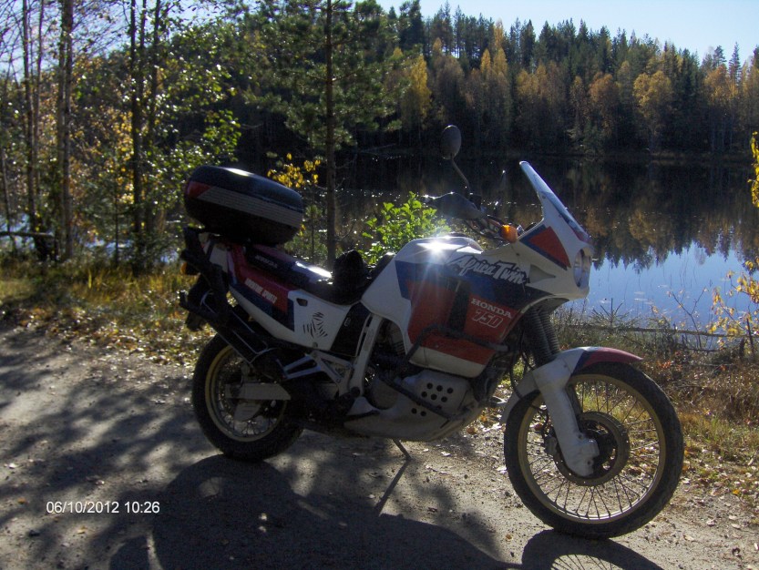 En solstråle treffer Jonny sin Honda 750 Africa Twin fra 1992 så den skinner som en diamant 🙂