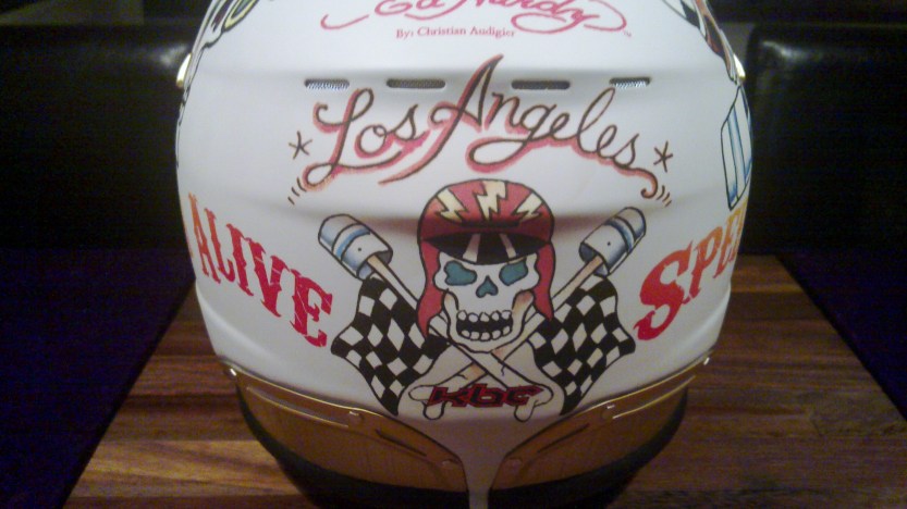 Så når damen med kort skinnskjørt, glimt i øyet og typ utringing mente at hjelmen jeg hadde plukket ut helt klart var ett riktig valg for meg måtte jeg selvfølgelig kjøpe denne. At ho i tillegg informerte om at hjelmen var preget av Christian Audigier og Ed Hardy (navn som selvfølgelig ikke sa meg noe) måtte jeg jo selvfølgelig trekke kortet. Men hvis hjelmen er godt nok for det Amerikanske cross laget er det vell godt nok for meg også.