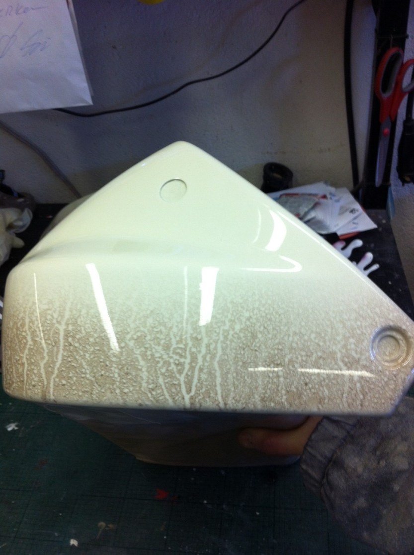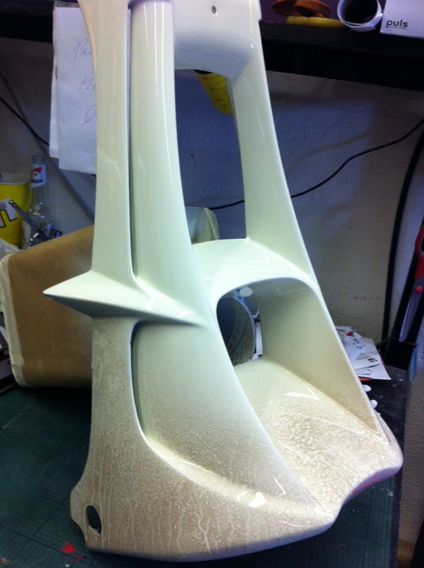 Da begynner ting og ta form. De første delene hos Camilla MC Dekor er ferdig lakkert. Fargen er perlemor California hvit (tror jeg det heter). I tillegg til denne fargen er effekter lagt på så den ser litt skitten ut. Til slutt vil motivene på den nye bakskjermen, tanken og vindskjermen bli lakkert.