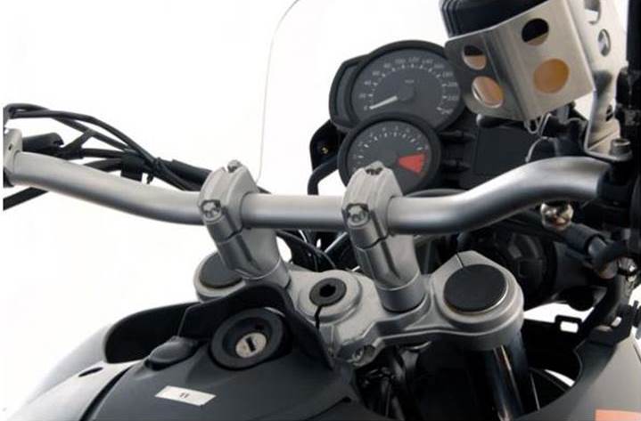 Low Pro 1-3/4″ center to center rise for BMW F800GS and KTM’s. This riser was developed around the F800GS ABS model. Riser barely clears the stock F800GS handlebar clamps and can be pivoted to your desired fore and aft location. Note; we moved our front brake perch inboard on the handlebar 3/8″ as well to releave even more brake line and to insure proper function. When installing these risers pivoted up and back on the F800GS we spin the OEM caps 180 degrees to make the final tightening bolt the forward bolt. Low Pro Riser clears KTM clamps as well, a recommended Riser for the 990 Adventure with stock lines. Low Pro Riser also has (1) 8mm tap hole in the end of the posts to mount what ever you desire, Ram ball, etc. Anodized Clear. Always check and confirm that your bike has adeguate cable and brakeline length before installing any handlebar risers. THESE RISERS DO NOT WORK ON THE F650GS TWINS. those bikes have 7/8 inch diameter bars