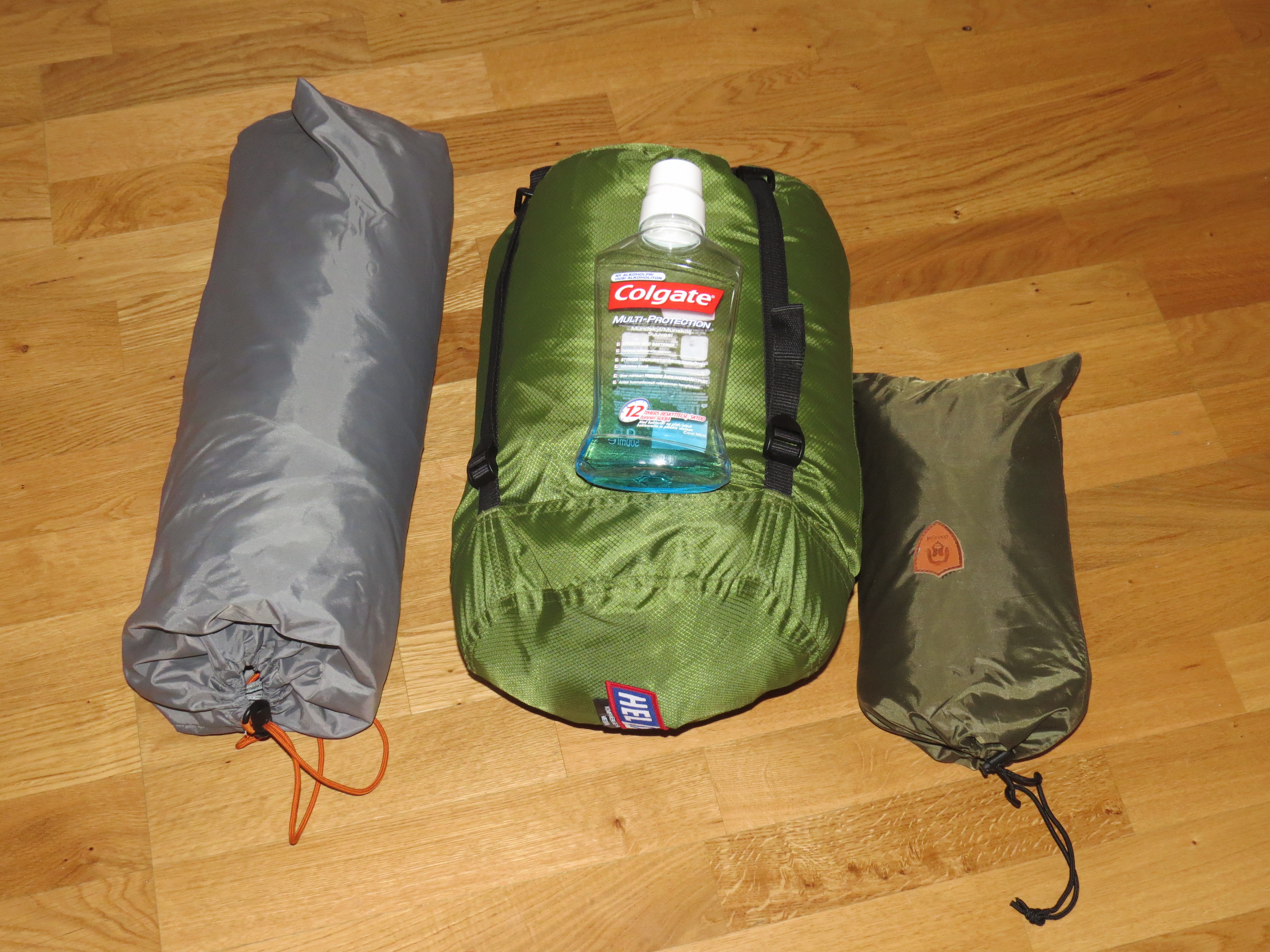 Hvis man passer på å kjøpe ting som har lav vekt og små byggemål tar det ikke så stor plass. Så når jeg legger en flaske med munnskyllevann oppå komprimeringstrekket synes jeg ikke volumet er så stort med tanke på at den inneholder sovepose, liggeunderlag, lakenpose og pute. Til høyre ligger tarp’en og helt til venstre ligger teltet.