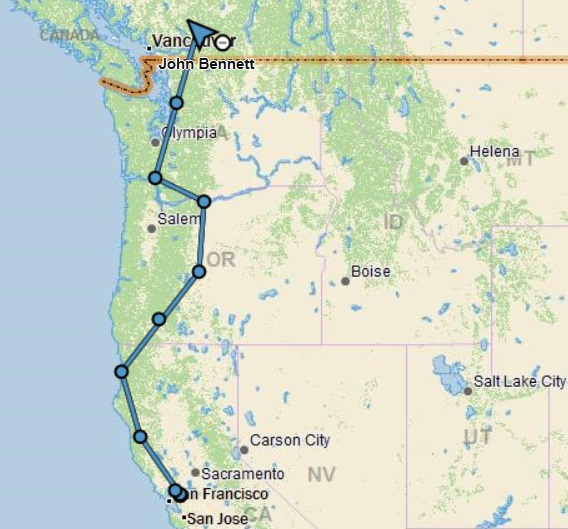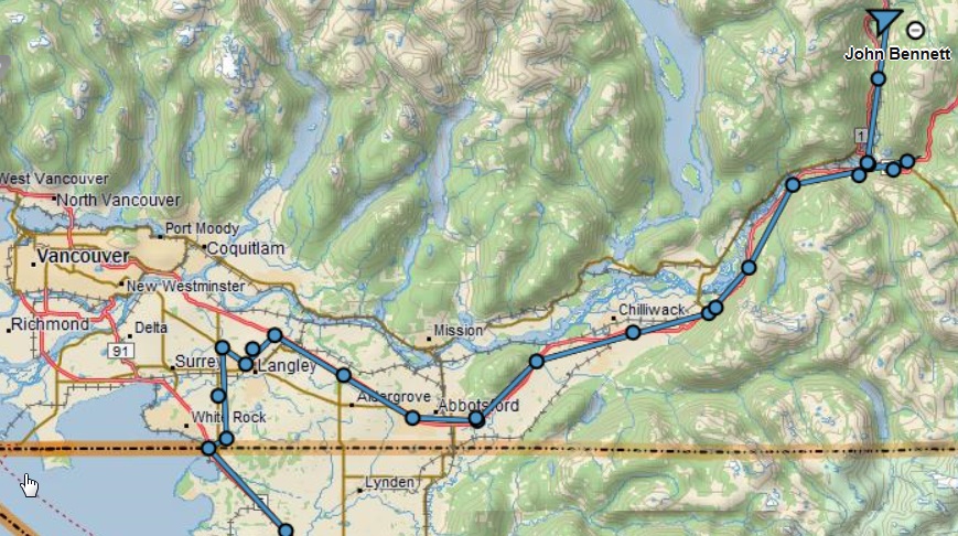 John som jeg etter planen skal møte i Fairbanks fortsetter sin tur nordover. Ser ut som han tilbragte natten i Vancouver i Canada og fortsatte nord – øst på Trans-Canada Highway langs Fraser River. Det ser ut til at veien snor seg langs elven og Trans-Canada Highway er nok en mye kjekkere mc vei enn British Columbia Highway 5 som går i samme retning litt lenger øst.