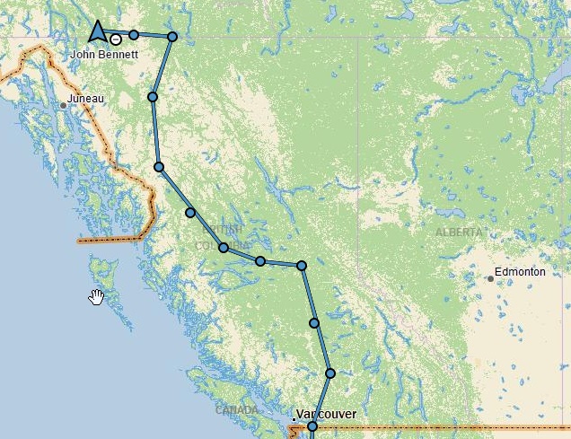 I følge Google map har han nå bare 1122 km igjen til Fairbanks, Alaska hvor jeg egentlig skal møte han så jeg får vell ta kontakt med han å høre hva planene hans er. Om han venter eller begynner på turen videre nordover uten meg.