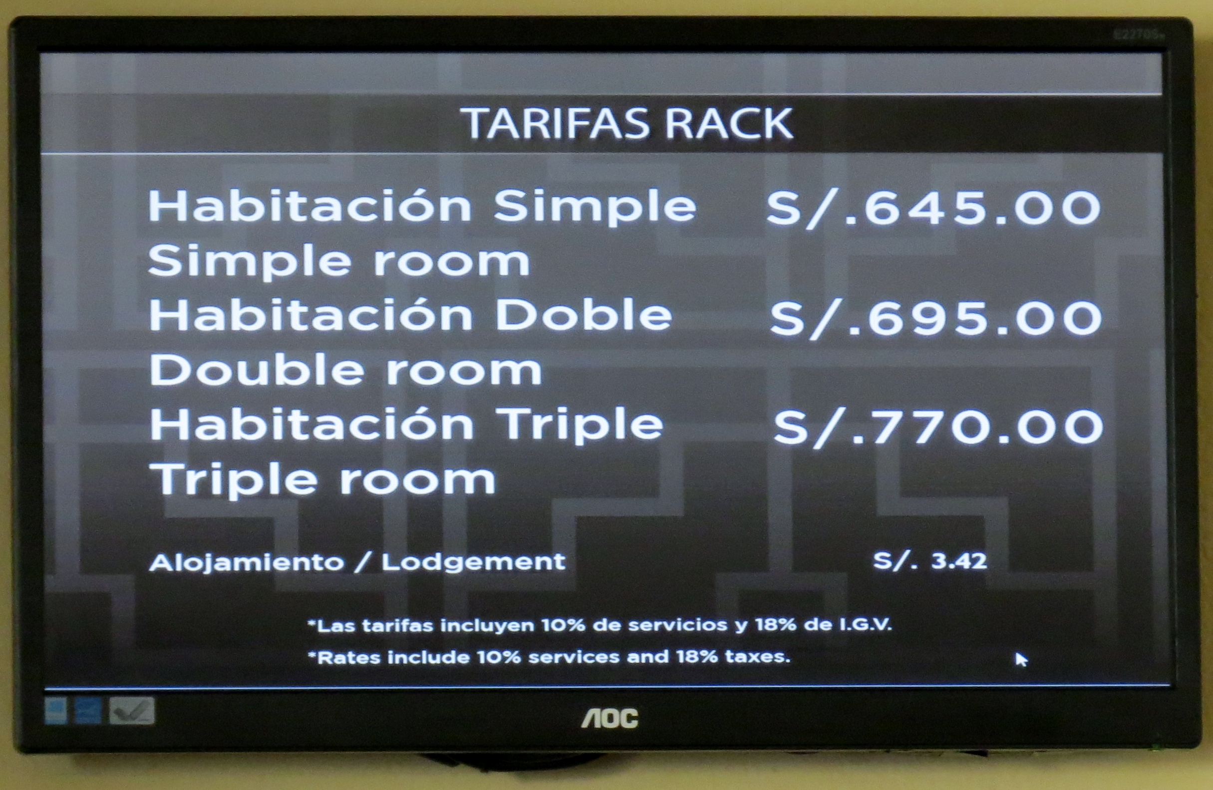 Ved hotel Sonesta Posadas Del Inca lå prisene 10 ganer så høyt som de hotellene jeg bruker å overnatte. 40 til 60 Soles er en naturlig pris for meg mens 645 Soles var langt over mitt budsjett. Jeg bare smilte til betjeningen da jeg så prisene på tv skjermen, snudde og var på vei ut igjen da de ropte etter meg at jeg kunne få en spesial ris siden det var lav sesong. Så etter å ha fått prisen ned i 297 Soles takket jeg ja til ett rom i dette 4 stjernes hotellet. Man må jo tross alt unne seg noe en gang i mellom.