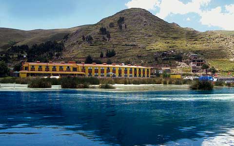 Fra rommet kunne jeg se direkte ut på Lake Titicaca eller ned i hagen hvor de var i gang med å klippe plenen,
