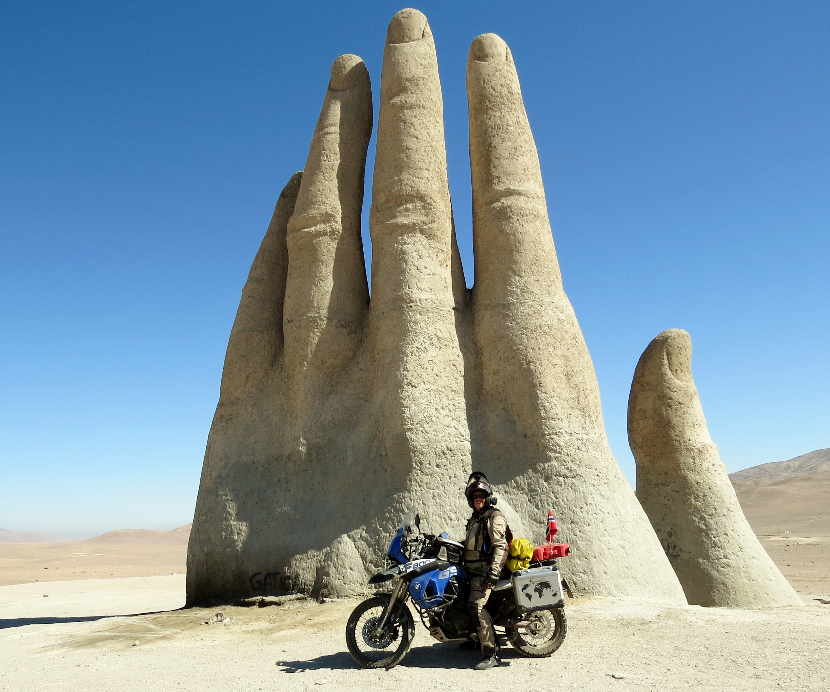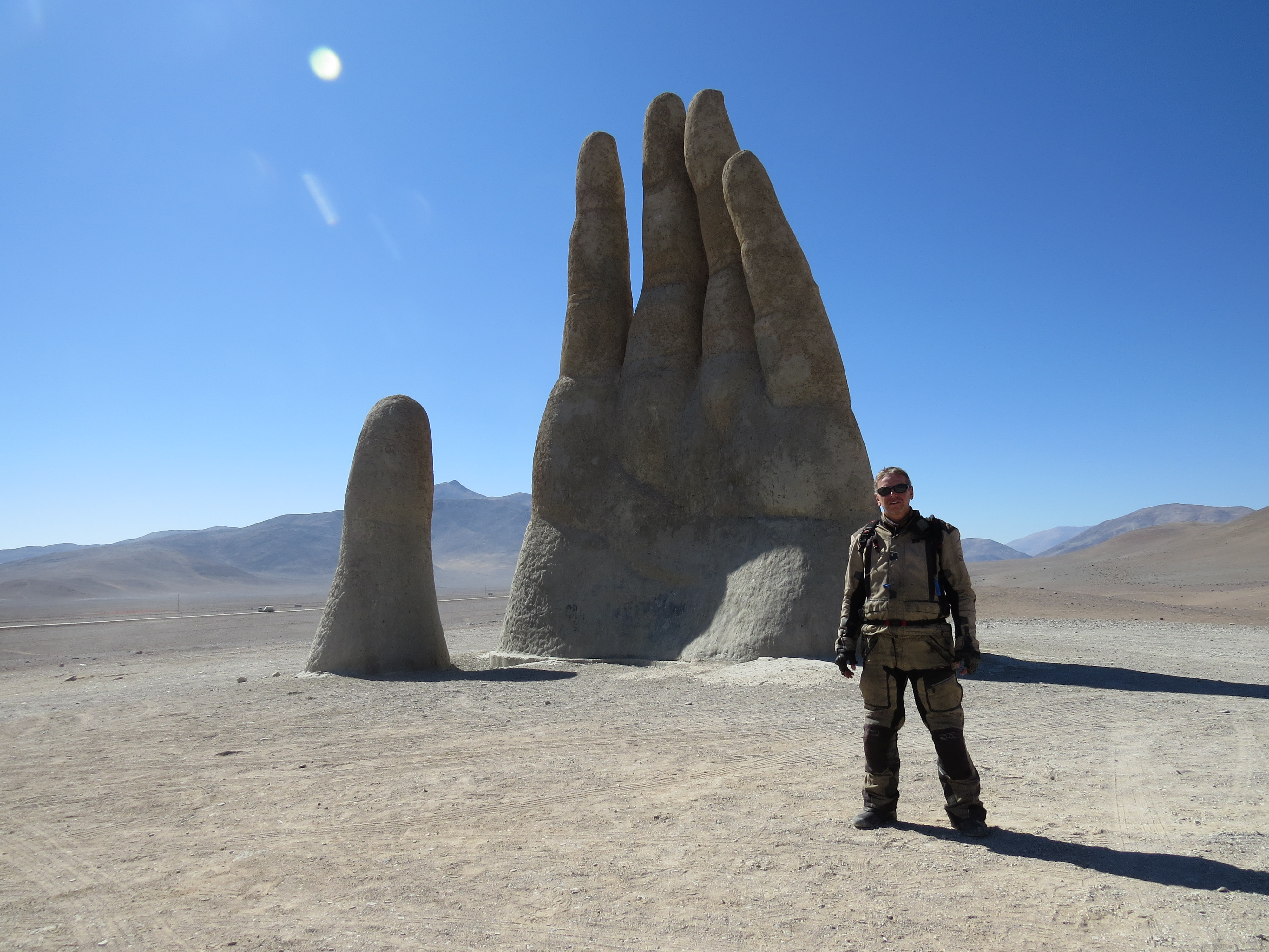 Her sto det også noen motorsyklister fra Brazil, og jeg fikk en av de til å ta dette bildet av meg på sykkelen foran Mano del Desierto.
