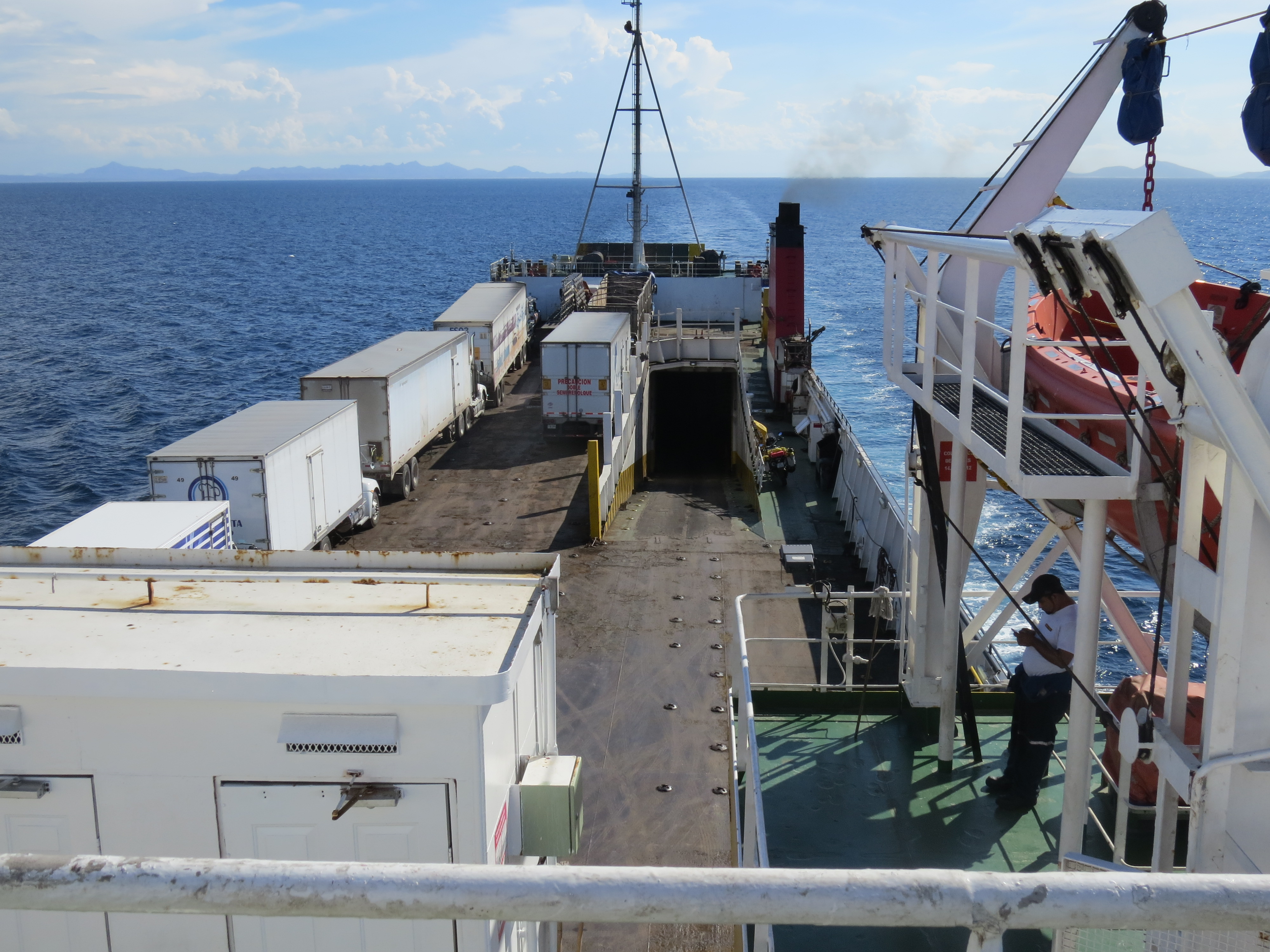 Selve prosessen med å ta fergen var egentlig grei. Man kjører først til en plass hvor de forlanger å se pass, papirer på sykkelen, klistremerket man fikk når man gjorde en midjetidligere import av sykkelen til Mexico pluss kvoteringen. Alt hadde jeg gjort klart så det lå i tankveska. Neste stopp var vekten. Her veier de sikkert alle store lastebiler før de kjører ombord. Det var dårlig med Engelsktalende her så det ble nok litt misforståelser så dermed endte jeg opp med å beta 76 pesos og fikk kvotering på dette. Neste stopp var billett kontoret til TMC. Jeg ga de papirene mine inklusiv de jeg hadde fått på vekten å da oppdaget de feilen. For det første skulle jeg ikke ha betalt disse 76 pesos’ene og for det andre manglet jeg ett papir jeg skulle fått. Jeg tror egentlig at de på vekten utførte prosessen som om jeg skulle tatt den andre fergen. Men dette ordnet seg, jeg fikk pengene tilbake og billett ble kjøpt.