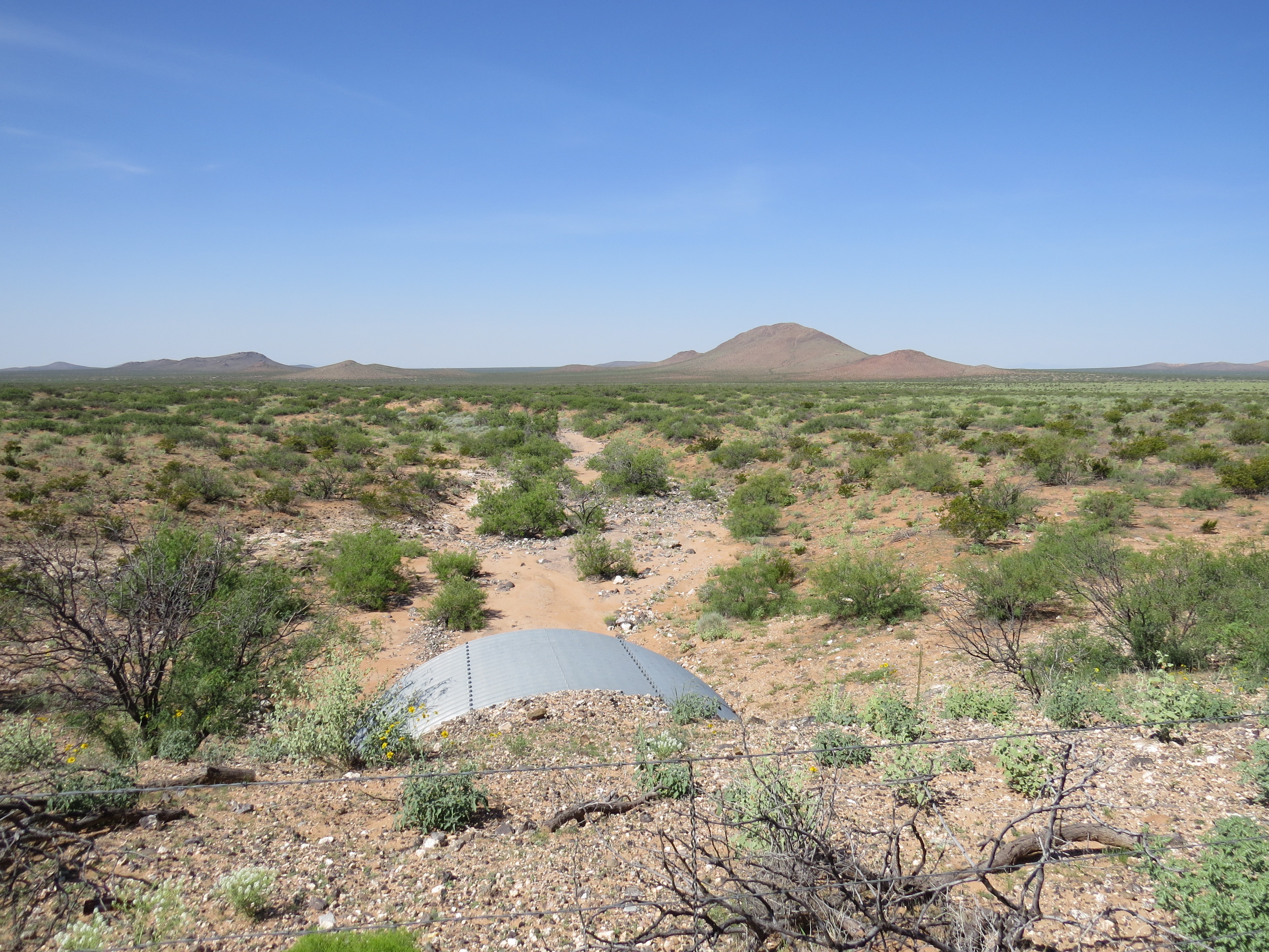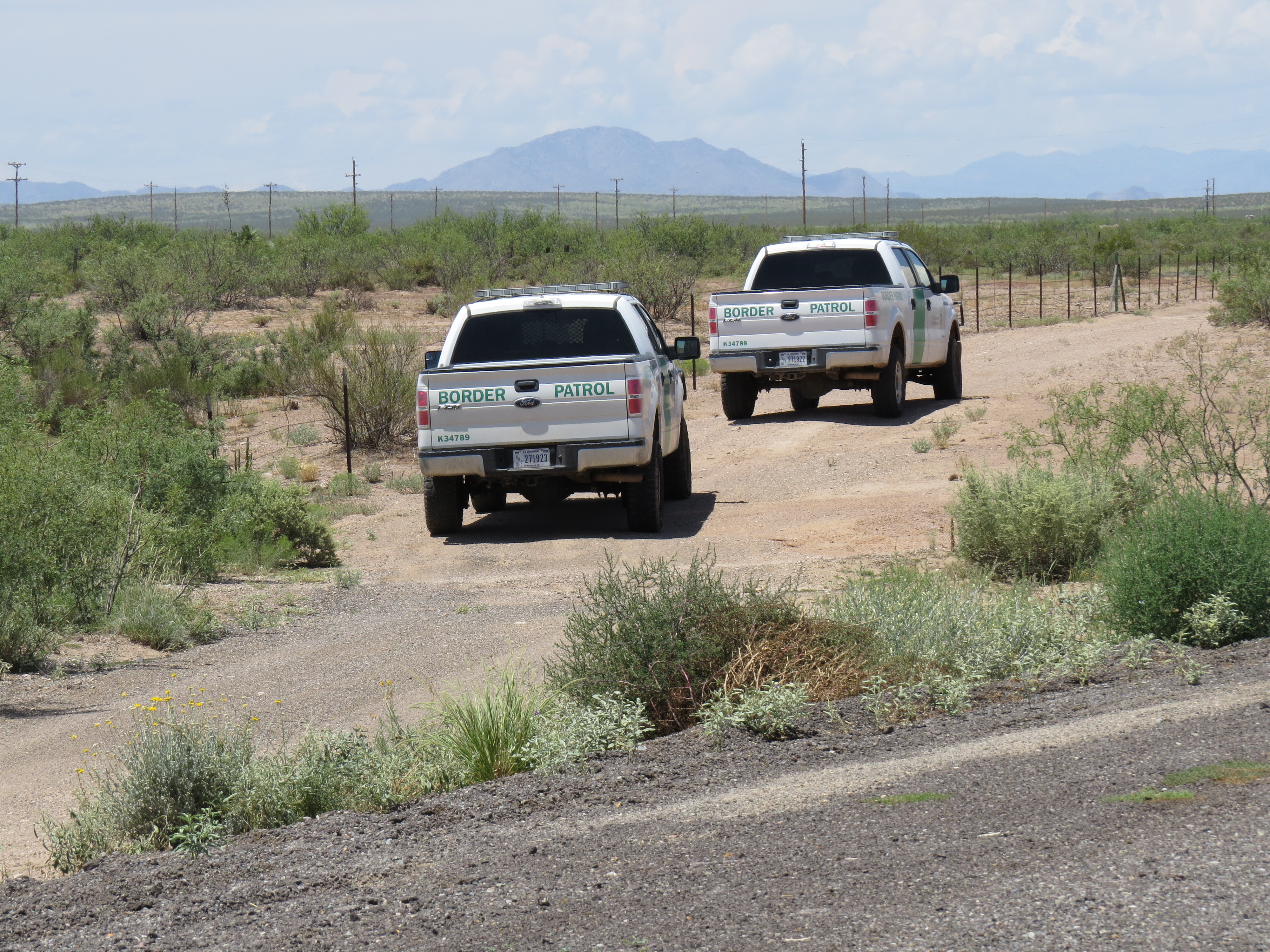 De 200 første kilometerne går helt inntil grensen til Mexico å dette merkes bl.a. med at Border Patrol bilene hele tiden er langs veien for å lete etter Mexicanere som forsøker å komme seg inn i US. Som man ser på bildet under går det en grusvei langs gjerdet bare 10-20 meter til venstre for den asfalterte veien jeg kjørte på. Border Patrol bilene kjørte frem og tilbake på disse grusveiene med 2 store traktordekk på slep. Regner med at hensikten med dekkene var å dekke sine egne spor slik at det skulle være lettere å avdekke fotspor av de som krysser grusen.
