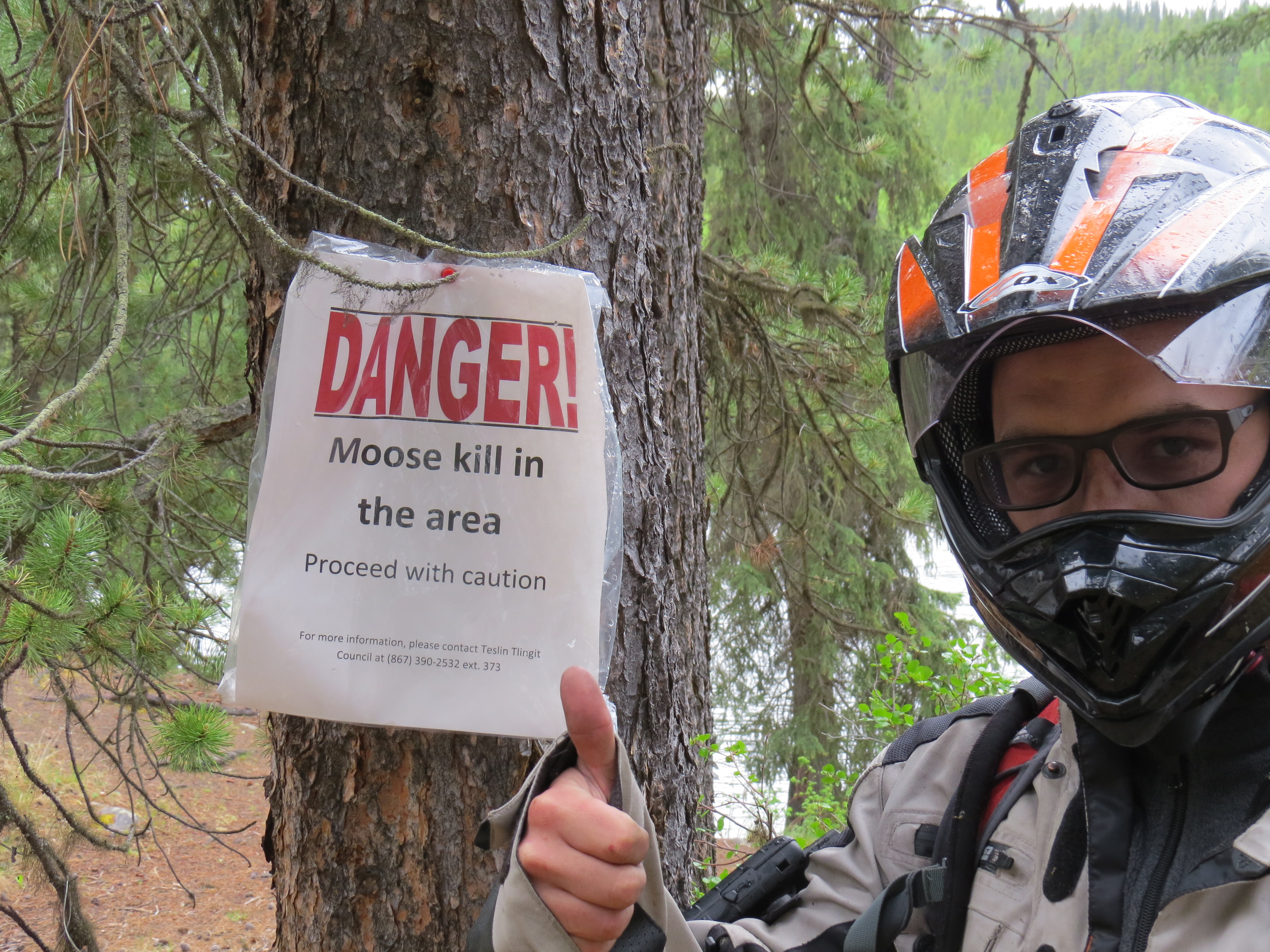 Turen videre gikk greit men  nå begynte det å bli mørke skyer i horisonten.  Å ganske riktig så begynte det snart å regne. Dvs det kom dråper men aldri skikkelig regn så regntøyet ble ikke satt på. Vi stoppet like vell en plass for å sjekke ut camping mulighetene ved en skikkelig idyllisk plass men vi fant ut at det var litt for tidlig på kvelden til å slå leir. I tillegg sto det faktisk ett skilt det om at elgene var aggressive å kunne drepe folk 🙂