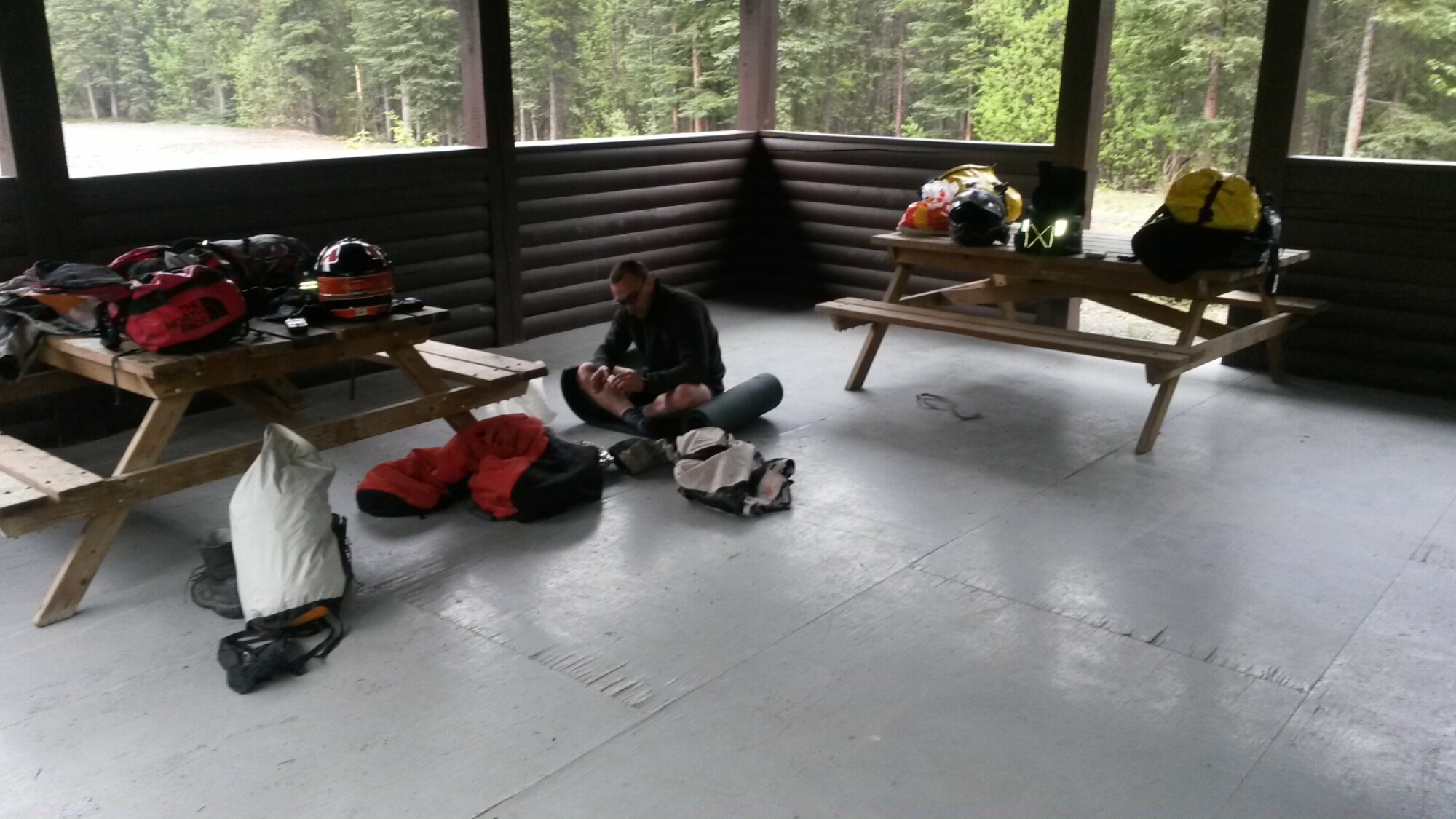 Så vi slo opp teltene innunder taket å gikk til ro rett før midnatt.  Jeg skal innrømme at tankene handlet litt om alle bjørnene vi hadde sett de siste timene  å her skulle vi overnatte ute i det fri på en rasteplass hvor de sikkert jevnlig sjekker om folk kaster fra seg matrester. Når John i tillegg begynte med en merkelig form for snorking ………….. ja dag var jeg rimelig sikker på at vi hadde fått besøk. Så det var bare å ligge helt i ro for å sjekke ut hva kunne skje. Jeg hadde kniven klart, mobilen var på så jeg kunne bruke lommelykt appen og til tillegg var kameraet lett tilgjengelig så jeg kunne bruke blitsen.  Om noen av disse tingene hadde fungert vet ikke jeg men heldigvis skjedde det ikke noe så det må ha vært John som snorket (tror jeg).