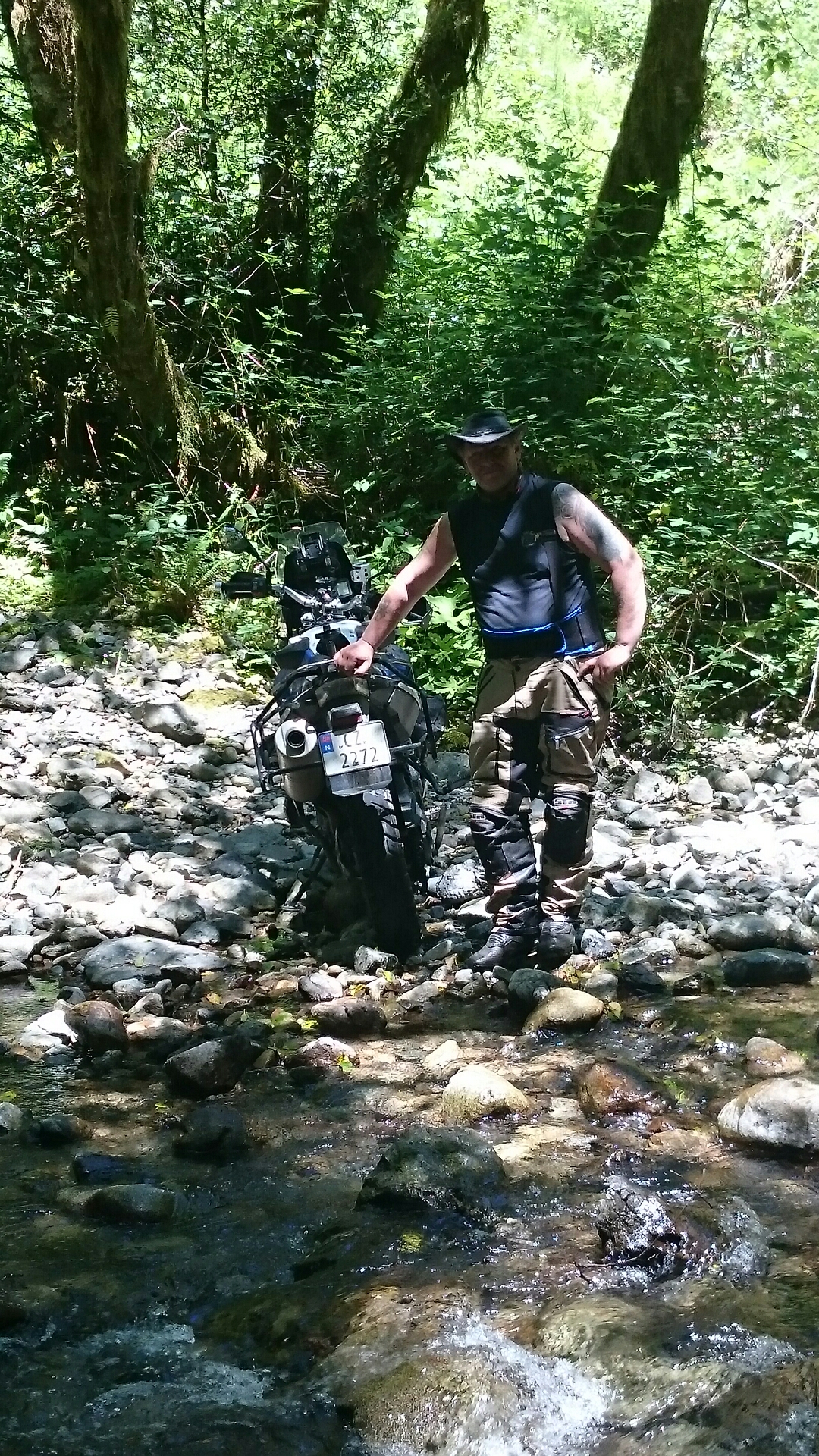 Vell nede ved vannet tok vi av all bagasjen før vi fikk syklene over. Første sykkelen var min. Støvlene mine holdt seg tørre, Terje  fikk vann opp til knærne så han var søkk våt og det samme gjaldt John.