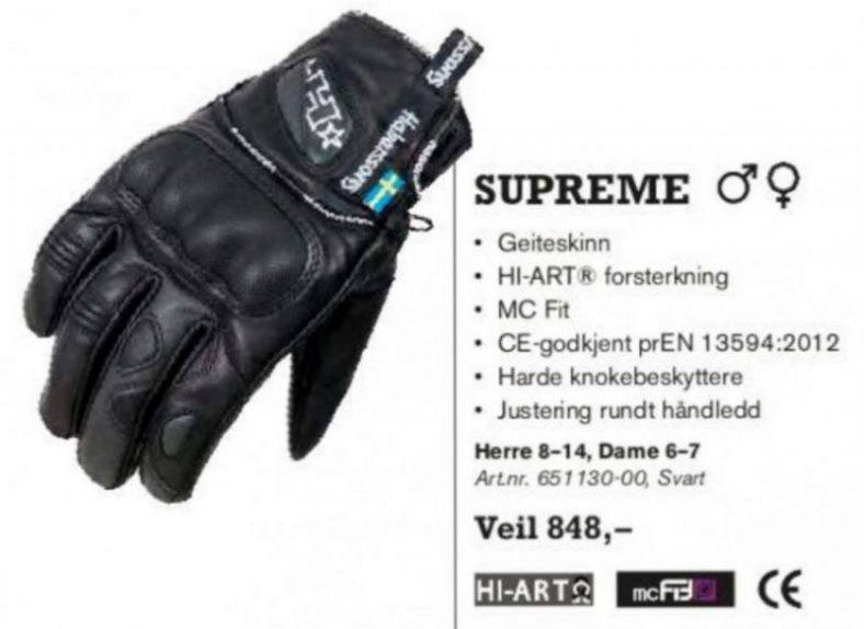 Hansker er ett litt vanskelig tema for meg 🙂 All sunn fornuft sier at man alltid skal bruke hansker når man kjører mc, men jeg sliter med at jeg MÅ ha luft på fingrene. Så i stede for å kjøre uten hansker, og i stede for å kjøre med fingerhansker bruker jeg vanlige hansker som jeg klipper av fingertuppene slik at jeg får litt luft. Noen har klaustrofobi……… jeg har ………. ikkeluftpåfingrenefobi 🙂 Jade hanskene var blitt så utslitt at de begynte å gå i oppløsning så i løpet av den andre turen til USA i sommer bearbeidet jeg Supreme hanskene slik jeg liker å ha mine hansker. Dermed fungerte de (for meg) optimalt selv om sikkerheten ikke er 100% ivaretatt. Beklager dette Cato 🙂 Hanskene sitter godt, skinnet er behagelig, grepet rundt styret er bra, de er ikke for tykke og lette å ta av/på.