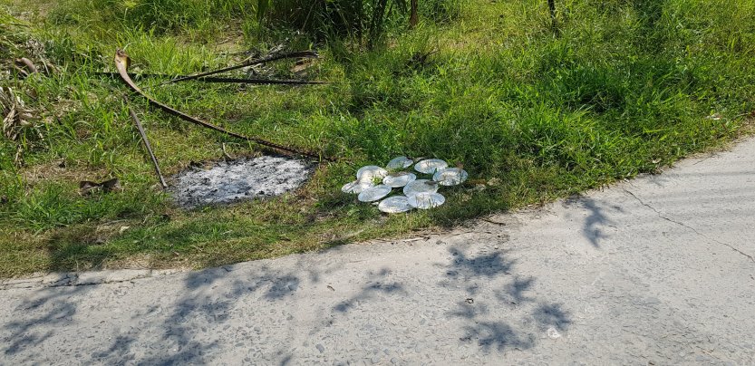 Her f.eks. var det en syklist som var drept. For å være sikker på at de onde åndene ikke gikk løs på den dreptes ånd som fortsatt befant seg i området setter de pårørende ut mat som åndene kan forsyne seg av.