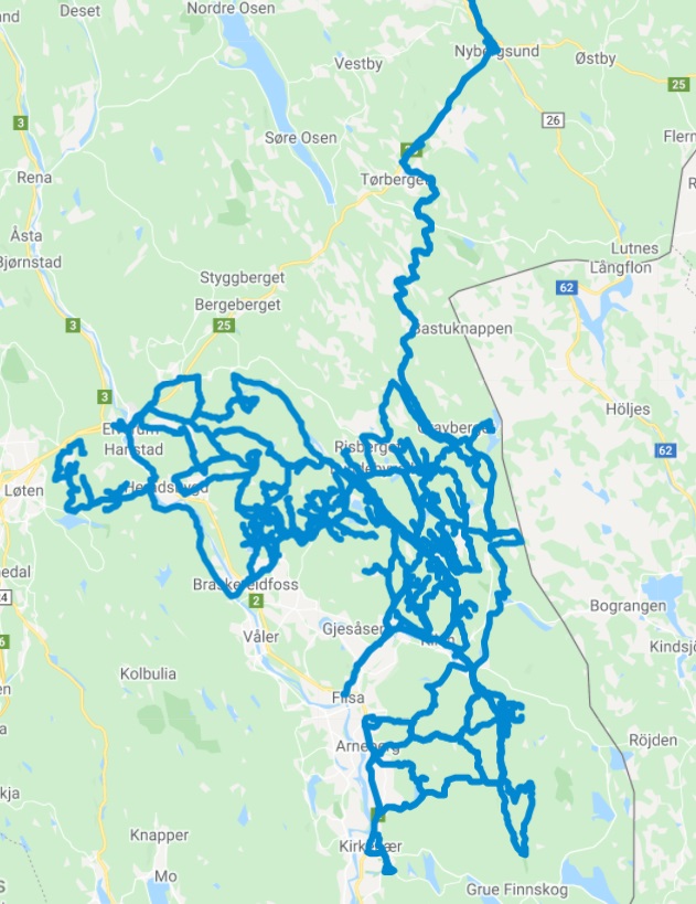 I løpet av de 8 dagene vi var der ble det kjørt i overkant av 140 mil, og svært få veier ble kjørt 2 ganger. Derimot ble mange veier kjørt i begge retninger 🙂 Både pga at ruta en annen dag endte slik eller pga at veien endte opp ett eller annet sted i skogen som gjorde at vi måtte kjøre ut samme vei.